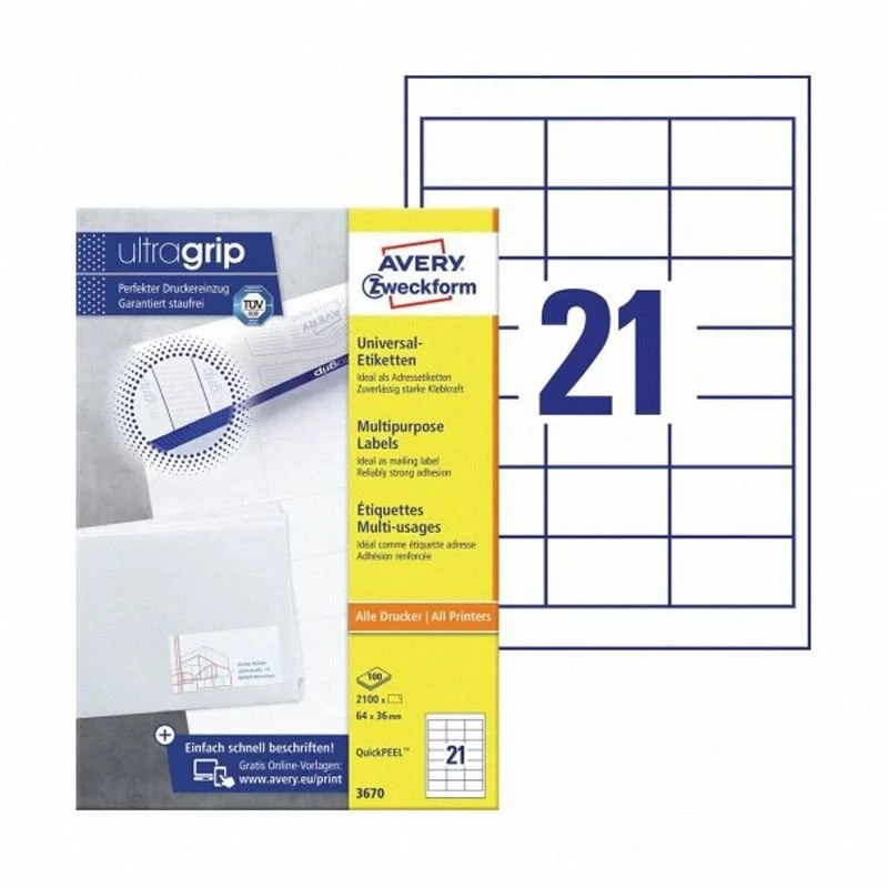 - Etykiety samoprzylepne, uniwersalne Avery Zweckform QuickPeel 3670 w kolorze białym. Łatwe w przyklejaniu i odklejaniu. Gwarancja trwałego, odpornego na ścieranie druku. Do zastosowania w drukarkach atramentowych, laserowych oraz kopiarkach.