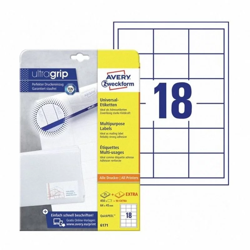 - Etykiety samoprzylepne, uniwersalne Avery Zweckform QuickPeel 6171 w kolorze białym. Łatwe w przyklejaniu i odklejaniu. Gwarancja trwałego, odpornego na ścieranie druku. Do zastosowania w drukarkach laserowych oraz kopiarkach.