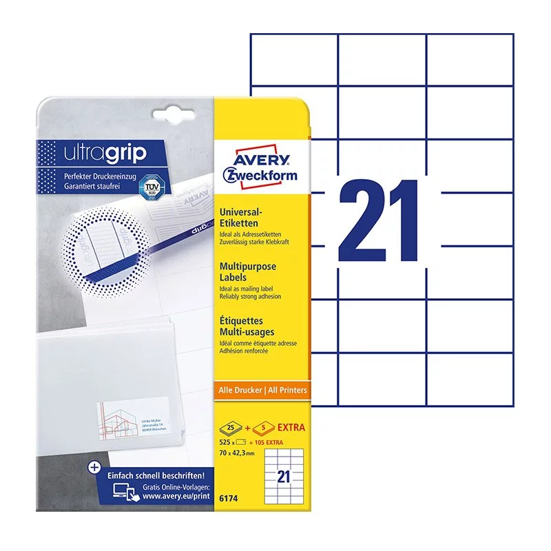 - Etykiety samoprzylepne, uniwersalne Avery Zweckform QuickPeel 6174 w kolorze białym. Łatwe w przyklejaniu i odklejaniu. Gwarancja trwałego, odpornego na ścieranie druku. Do zastosowania w drukarkach laserowych oraz kopiarkach.