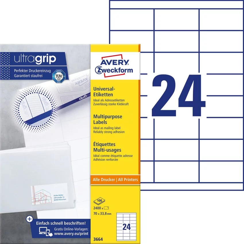 - Etykiety samoprzylepne, uniwersalne Avery Zweckform 3664 to idealne rozwiązanie dla Twojego biura. Trwałe do wszechstronnego zastosowania. Idealne do zadruku w drukarkach laserowych i kopiarkach.