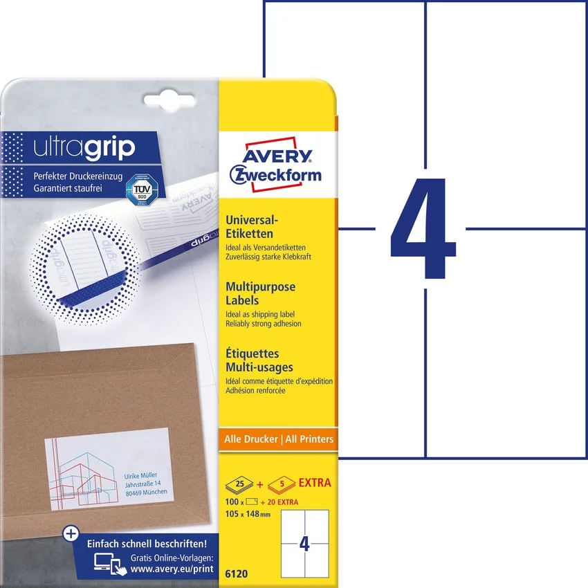- Etykiety samoprzylepne, uniwersalne Avery Zweckform 6120, kolor biały. Do użytku w drukarkach laserowych oraz kopiarkach. Zapewniają ostry wydruk bez wycieku kleju poza krawędź etykiety.