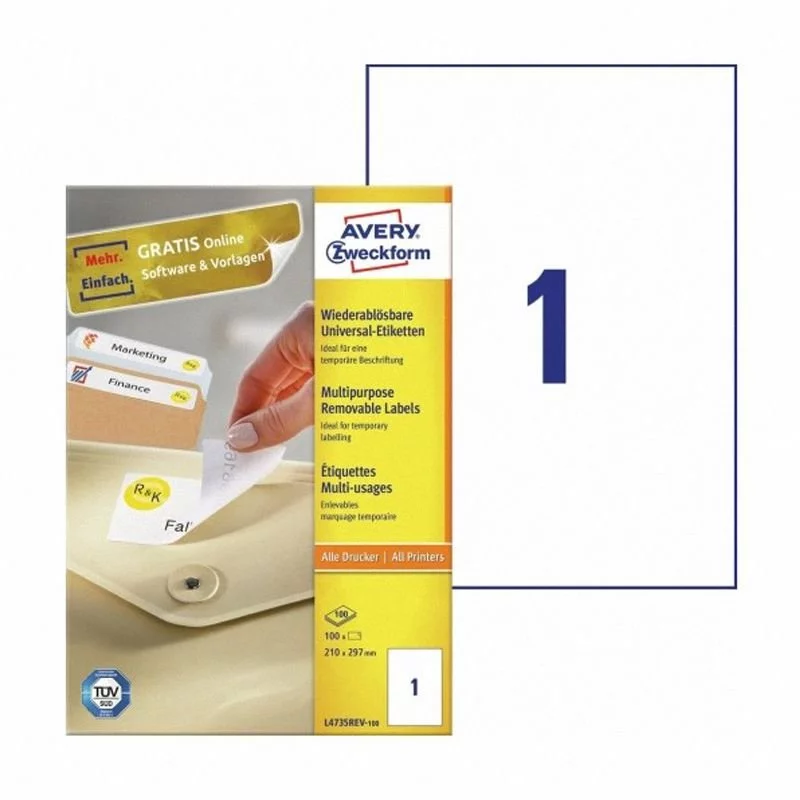 Etykiety Samop. Avery 210x297 1/A4 A'100 Usuwalne Białe No.L4735REV-100