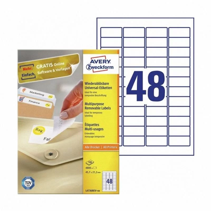 - Etykiety, samoprzylepne, usuwalne Avery Zweckform L4736REV-100. Do drukarek laserowych i kopiarek. Bardzo wytrzymałe i odporne na podarcie. Nie pozostawiają śladów kleju.