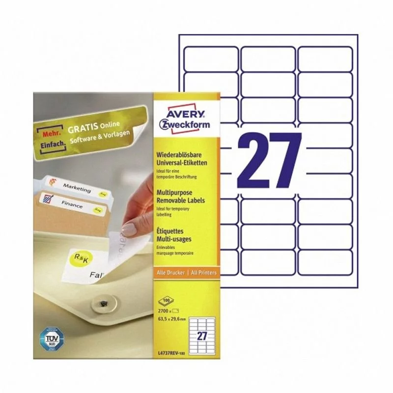 - Etykiety, samoprzylepne, usuwalne Avery Zweckform L4737REV-100. Do drukarek laserowych i kopiarek. Bardzo wytrzymałe i odporne na podarcie. Nie pozostawiają śladów kleju.