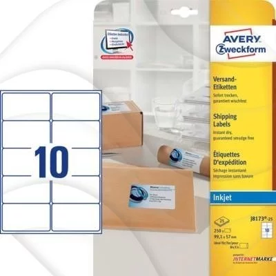 - Etykiety do drukarek atramentowych Avery Zweckform J8173-25, kolor biały; Tuszy wysycha na nich zaraz po wydrukowaniu, nie rozmazują się. Ostry wydruk i doskonałe przyleganie do powierzchni.