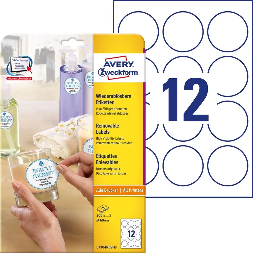 - Okrągłe, samoprzylepne, etykiety Avery Zweckform L7104REV-25. Idealne rozwiązanie przy tworzeniu etykiet cenowych czy promocyjnych. Do drukarek atramentowych, laserowych oraz kopiarek. Łatwo usuwalne.