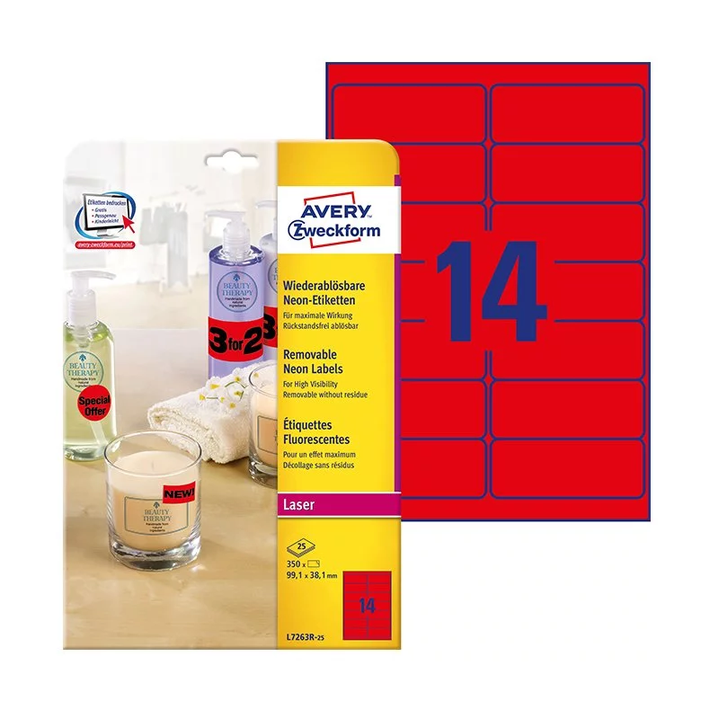 - Etykiety samoprzylepne Avery Zweckform L7263R-25, kolor neonowy czerwony, usuwalne. Łatwe w usunięciu, nie pozostawiają śladów kleju. Do drukarek atramentowych, laserowych oraz kopiarek. Posiadają certyfikat ekologiczny FSC oraz certyfikat jakości TÜV.