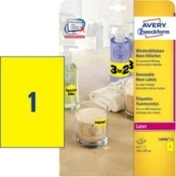 - Etykiety samoprzylepne Avery Zweckform L6006-25 w kolorze neonowym żółtym, usuwalne. Łatwe w usunięciu, nie pozostawiają śladów kleju. Do drukarek atramentowych, laserowych oraz kopiarek. Posiadają certyfikat ekologiczny FSC oraz certyfikat jakości TÜV.