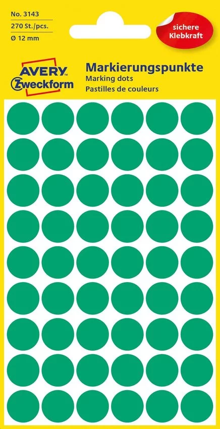 - Kółka do zaznaczania Avery Zweckform 3143, kolor zielony. Świetnie sprawdzą się do zaznaczania dat urlopów, spotkań czy miejsc na mapie. Szeroki asortyment rozmiarów i kolorów. Idealne do kolorystycznego oznaczania dokumentów.