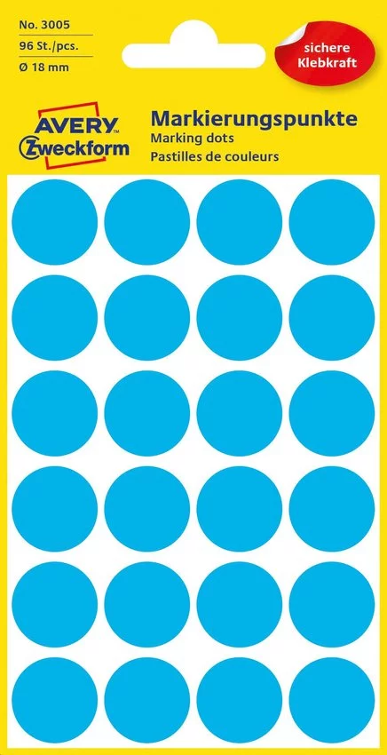- Kółka Avery Zweckform 3005, kolor niebieski. Świetnie sprawdzą się do zaznaczania dat urlopów, spotkań czy miejsc na mapie. Szeroki asortyment rozmiarów i kolorów. Idealne do kolorystycznego oznaczania dokumentów.