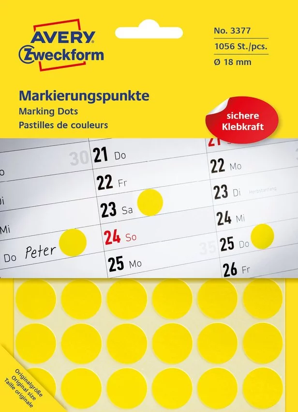 - Kółka Avery Zweckform 3377, kolor żółty. Świetnie sprawdzą się do zaznaczania dat urlopów, spotkań czy miejsc na mapie. Szeroki asortyment rozmiarów i kolorów. Idealne do kolorystycznego oznaczania dokumentów.