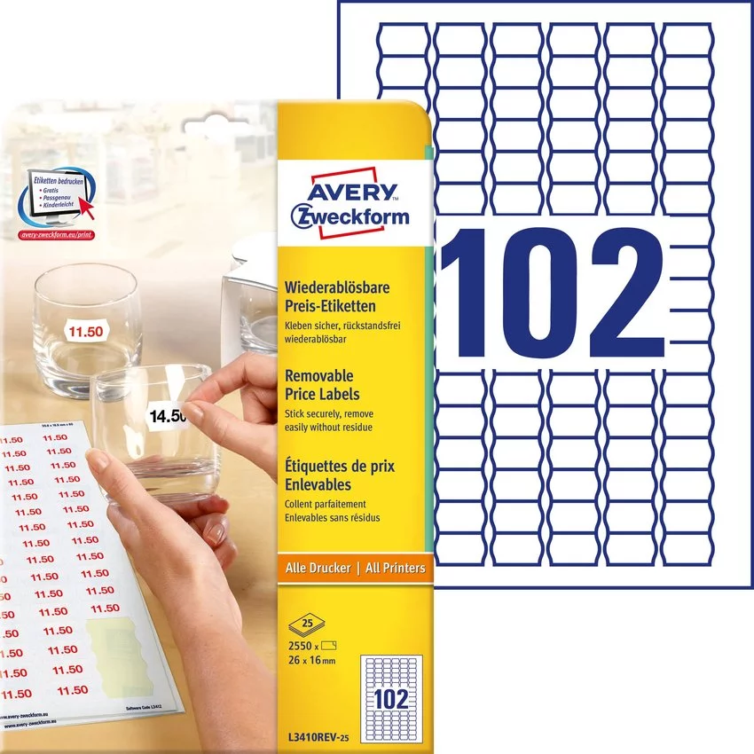 - Usuwalne etykiety cenowe Avery Zweckform L3410REV-25 w kolorze białym. Mocno kryjące. Łatwe do usunięcia. Do zadruku w drukarkach atramentowych, laserowych oraz kopiarkach