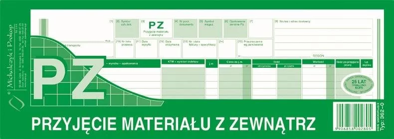 PZ Przyjęcie Materiału z Zewnątrz 1/2 A4 Wielok. Poziom 362-0 /MiP