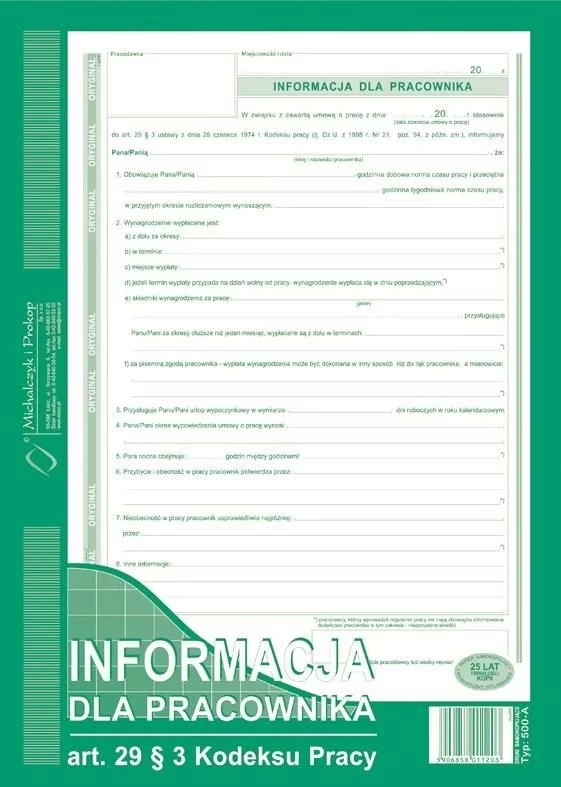Informacja dla Pracownika A4 Oryg.+1k Pion 500-A /MiP