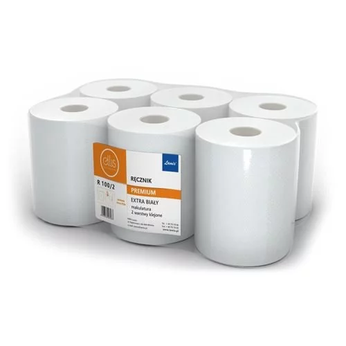 - Premium ręcznik papierowy R100/1 biały z makulatury, 2-warstwowy, gofrowany z perforacją, długość 100 m, średnica 18,5 cm, szerokość 19,2 cm. Opakowanie zbiorcze: 6 rolek.