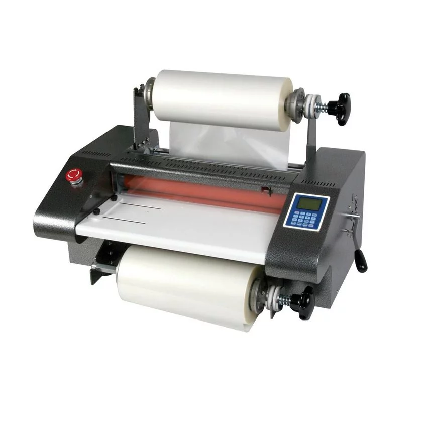 Profesjonalny laminator rolowy przeznaczony do dużych punktów usługowych. Wyposażony w nowoczesny panel sterowania z wyświetlaczem ciekłokrystalicznym umożliwiającym programowanie indywidualnych ustawień laminacji. Posiada pokryte silikonem tzw. „gorące wałki” z udoskonaloną jakością i szybkością laminacji oraz obcinarkę krążkową służącą do obcinania laminatu. Dodatkowo dzięki zastosowaniu czujników podczerwieni zapewniamy dokładniejszą stabilizację temperatury wałków. Laminator przystosowany jest także do laminacji zwykłą, formatowaną folią. Prędkość laminacji 4 m/min.