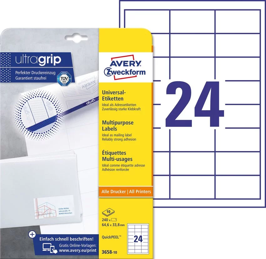 Etykiety Samoprzylepne Avery 64,6x33,8 10/A4 A'24 Białe No.3658-10