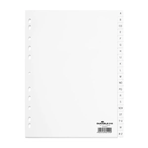Prezentujemy przekładki znanej niemieckiej marki Durable. Są bardzo wytrzymałe (wykonano je z polipropylenu) i zawierają nadrukowane, alfabetyczne indeksy, które z pewnością ułatwią Ci wyszukiwanie odpowiednich dokumentów. Dodatkowo, posiadają uniwersalną perforację, więc idealnie nadają się do wszystkich standardowych segregatorów.
