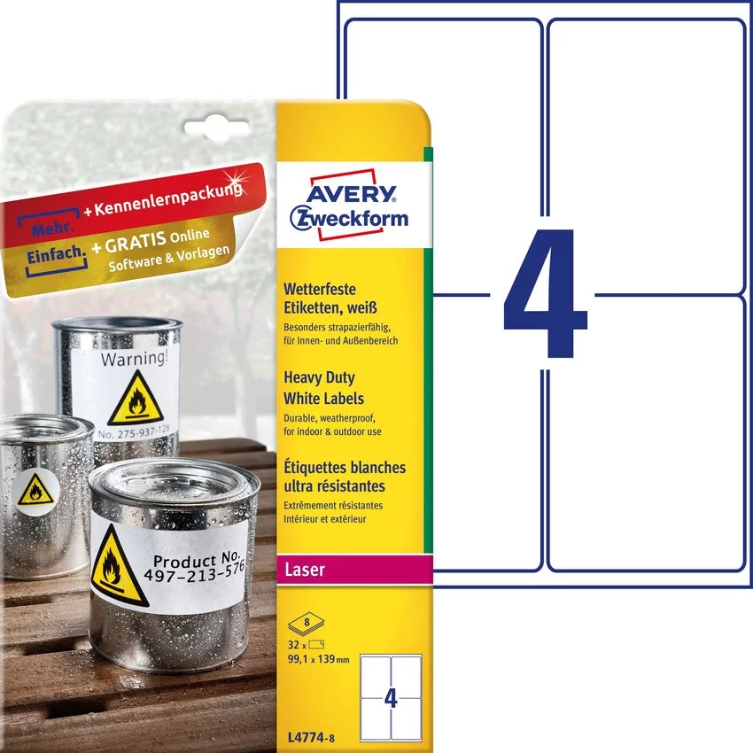 Etykiety Poliestrowe Wodoodporne Avery 99.1x139mm 4/A4 A'8 Białe No.L4774-8