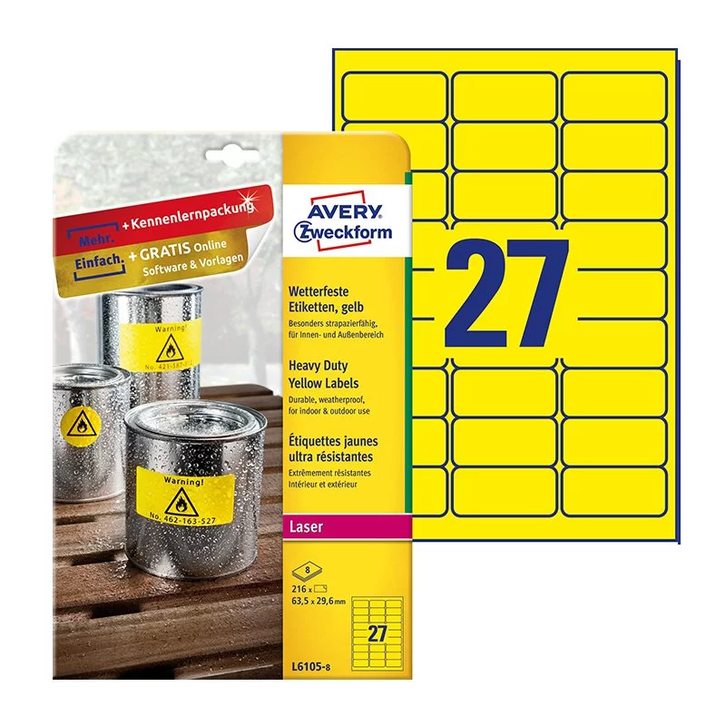 Etykiety Poliestrowe Wodoodporne Avery 63.5x29.6mm 27/A4 A'8 Żółte No.L6105-8