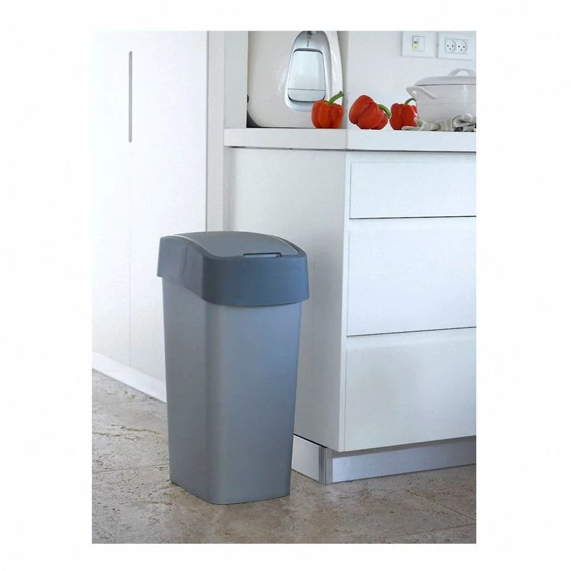 - Kosz na śmieci Curver Flip Bin 25L, szary z kolorową obręczą. Ręcznie otwierana pokrywa ukrywa zawartość i ogranicza zapachy. Wymiary: 26x34x47 cm. Idealny do domowej segregacji odpadów.