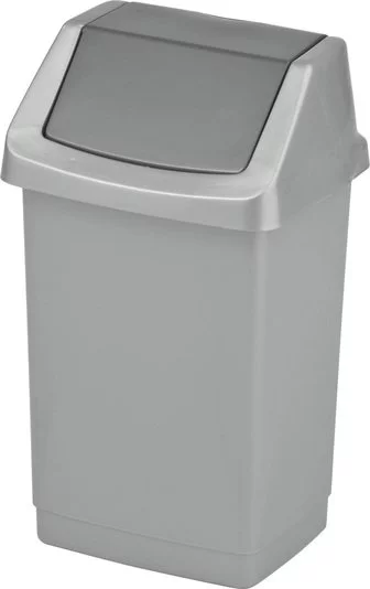 - Kosz na śmieci Curver 50L, srebrno-grafitowy, z uchylnym mechanizmem Click-It. Trwałe tworzywo, łatwe czyszczenie, szczelna pokrywa ogranicza zapachy, idealny do kuchni, biura i pomieszczeń gospodarczych.