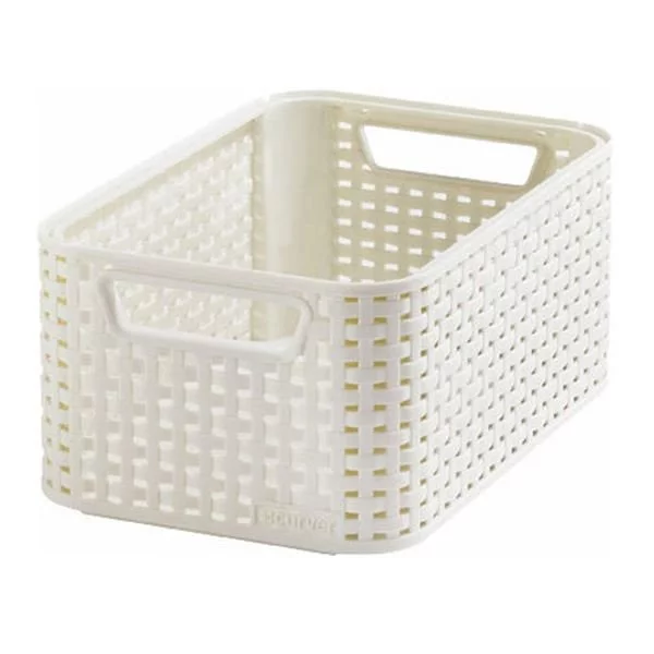 - Mały kremowy koszyk Curver z tworzywa imitującego rattan, idealny do przechowywania drobnych akcesoriów w domu. Wzmocnione, zintegrowane uchwyty. Wymiary: 285 x 194 x 130 mm.