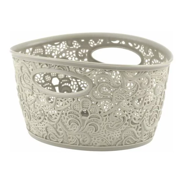 - Lekki, wytrzymały koszyk Victoria Mini Curver w kolorze kremowym z dwoma wzmocnionymi uchwytami i ażurową dekoracyjną konstrukcją. Wymiary: 220 x 170 x 120 mm.