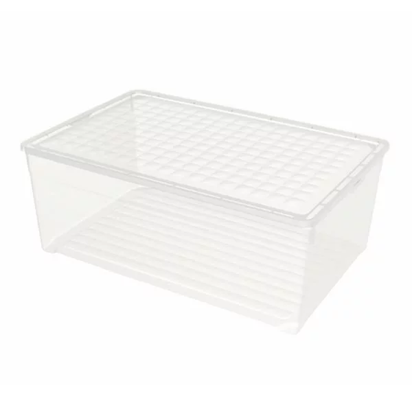 - Przezroczysty pojemnik Curver Textile 45L z szczelną pokrywą, idealny do porządkowania szaf. Możliwość piętrowania pudeł, łatwa kontrola zawartości, ochrona przed rozsypaniem i kurzem. Wymiary: 596x394x230 mm.