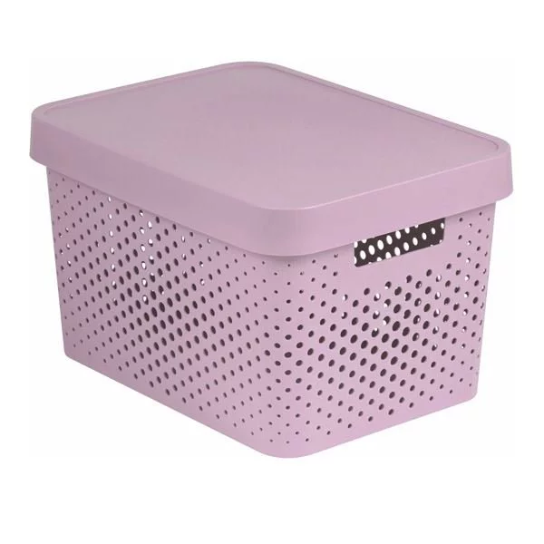 • Pojemnik ażurowy Curver Infinity 17L z pokrywką, różowy. Idealny do przechowywania żywności, ubrań, książek i dokumentów. Zapewnia cyrkulację powietrza, możliwość piętrowania, styl skandynawski.