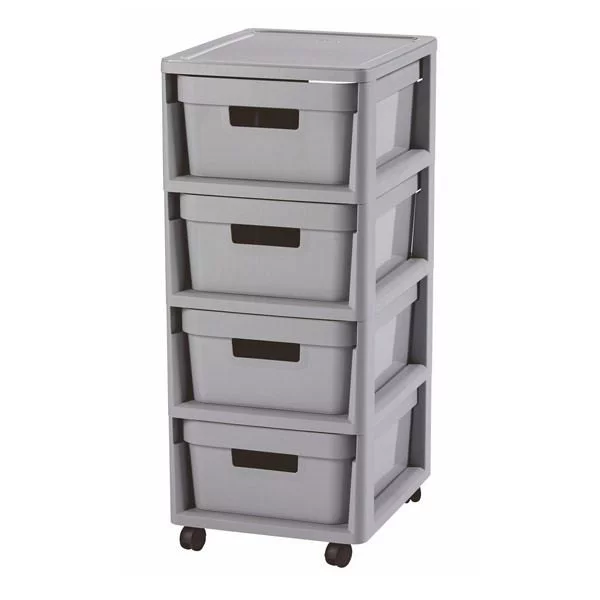 Wysokiej jakości tworzywo sztuczne, nowoczesna linia Infinity oraz neutralny, szary odcień sprawiają, że regał pasuje do współczesnych wnętrz domowych i profesjonalnych. Cztery pełne szuflady o pojemności 10 L każda pozwalają oddzielić od siebie kosmetyki, dokumenty, akcesoria biurowe czy środki czystości, a praktyczne kółka ułatwiają swobodne przemieszczanie całej konstrukcji tam, gdzie aktualnie jest potrzebna.