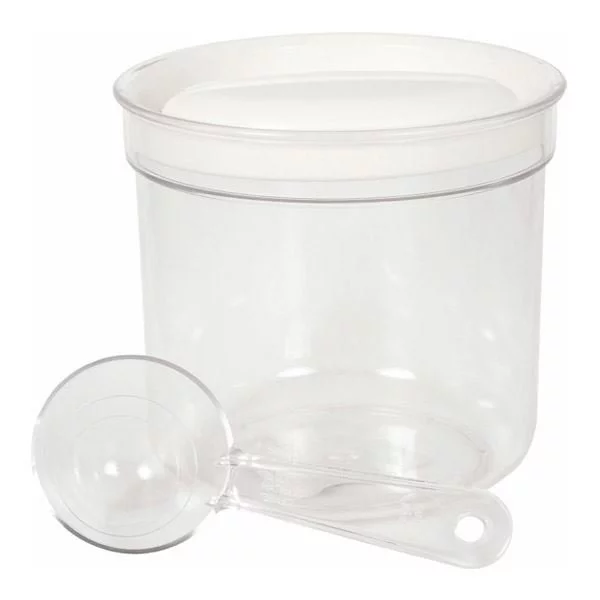 Pojemnik wykonany jest z wysokiej jakości tworzywa przeznaczonego do kontaktu z żywnością, co potwierdzają odpowiednie certyfikaty. Solidna konstrukcja, zamknięcie dopasowane do krawędzi oraz dołączona miarka ułatwiają codzienne użytkowanie podczas gotowania i pieczenia. Biało–transparentne wykończenie sprawia, że pojemnik prezentuje się estetycznie zarówno w domowej kuchni, jak i w niewielkich punktach gastronomicznych.