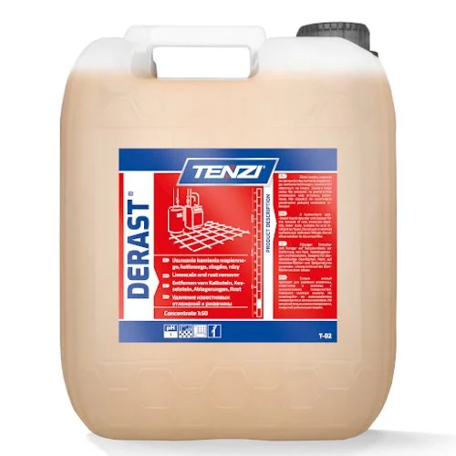 - TENZI Derast 10L – profesjonalny koncentrat do odrdzewiania i odkamieniania starych urządzeń sanitarnych. Skutecznie usuwa kamień, rdzę, beton i cement z powierzchni odpornych na kwas solny.