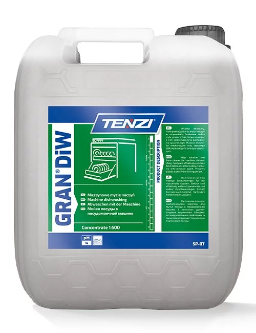 - Bezzapachowy, skoncentrowany, wysoko alkaliczny płyn do zmywarek TENZI Gran Diw 20L. Skutecznie usuwa zabrudzenia spożywcze, chroni naczynia przed korozją i żółknięciem, do szkła, aluminium i tworzyw sztucznych.