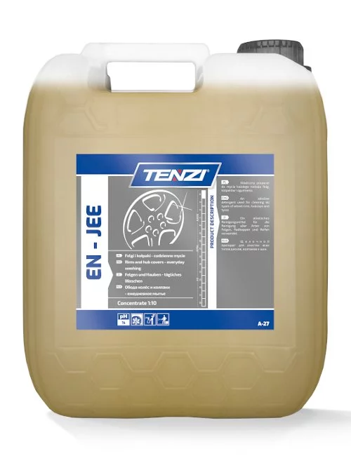 Tenzi En-Jee 10L to mocno skoncentrowany, alkaliczny preparat do szybkiego i bezpiecznego mycia kół, felg aluminiowych i stalowych oraz kołpaków, stworzony z myślą o intensywnej eksploatacji w myjniach samochodowych oraz profesjonalnych punktach autodetailingu. Produkt skutecznie rozpuszcza typowe zanieczyszczenia drogowe – w tym uporczywy pył z klocków hamulcowych – ułatwiając ich usunięcie bez konieczności długotrwałego szorowania. Jednocześnie formuła została opracowana tak, aby przy właściwym stosowaniu nie naruszać lakieru felg ani powierzchni kołpaków, co czyni środek odpowiednim do regularnej pielęgnacji różnego rodzaju obręczy. Duża pojemność 10 litrów w połączeniu z możliwością rozcieńczania czyni En-Jee rozwiązaniem wyjątkowo ekonomicznym, wydajnym i wygodnym wszędzie tam, gdzie liczy się szybki efekt czystych kół oraz optymalizacja kosztów chemii samochodowej.