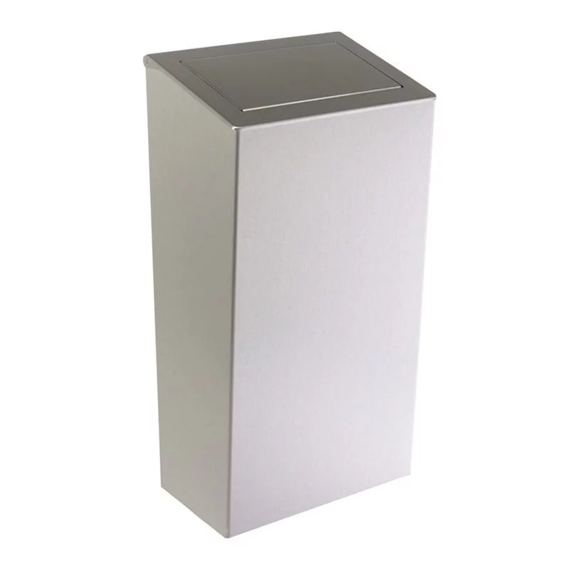 Kosz na śmieci z pokrywą uchylną to bardzo pojemny model. Wykonany jest z stali nierdzewnej matowej, która nadaje mu dużą odporność na uszkodzenia oraz elegancki wygląd. Pojemnik na odpady w prosty sposób montowany jest na ścianie. Równie łatwo czyści się go i konserwuje. Dzięki uchylnej pokrywie, zasłaniającej wnętrze kosza, zapewnia on wysoki poziom higieny. Polecany jest do toalet publicznych o wysokim natężeniu ruchu.