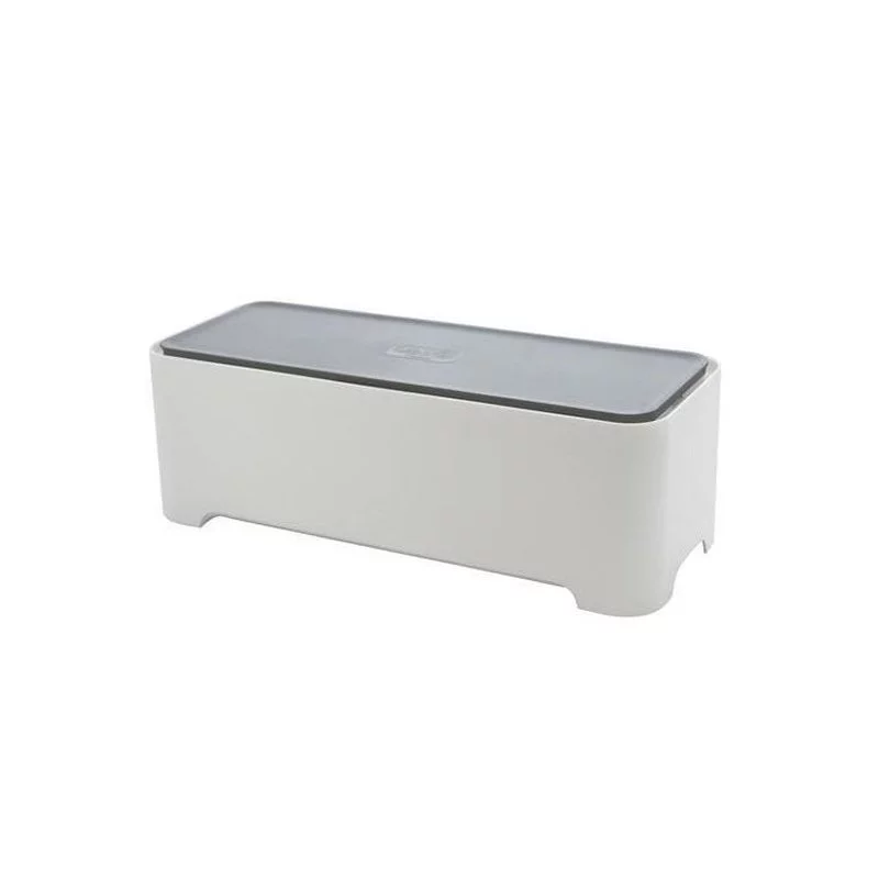 Model E-Box M wykonany jest z wytrzymałego tworzywa sztucznego wysokiej jakości, które łatwo utrzymać w czystości i które dobrze sprawdza się przy codziennym użytkowaniu. Przemyślane otwory w pokrywie i po bokach umożliwiają wygodne wyprowadzenie kabli, a system szczelin wentylacyjnych poprawia cyrkulację powietrza wokół listwy zasilającej. Kompaktowe wymiary 36 x 14 x 12 cm pozwalają na ustawienie pojemnika na biurku, pod nim lub na półce, bez zabierania cennego miejsca.