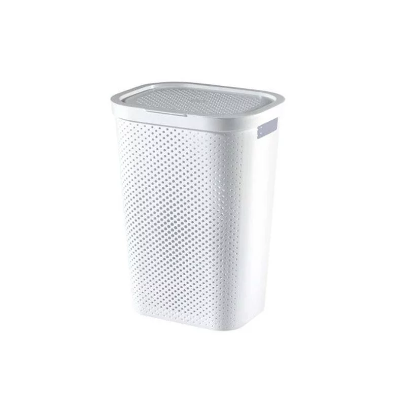 - Kosz na bieliznę Curver Infinity Recycled 60 L, biały, z tworzywa w 100% z recyklingu, skandynawski design, otwory wentylacyjne, dwa uchwyty, idealny do łazienki i pralni.