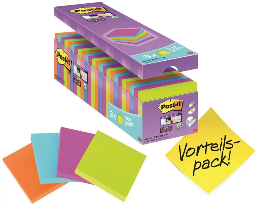 Bloczki Samoprzylepne Post-It Super Sticky (654-Ss-Vp24Col) 76X76Mm 24X90 Kart. Mix Kolorów 3 Bloczki Gratis