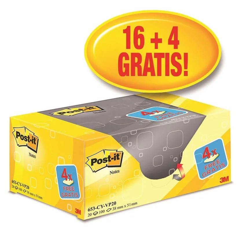 Bloczek Samoprzylepny Post-It (653Cy-Vp20) 38X51Mm 20X100 Kart. Żółte 4 Bloczki Gratis