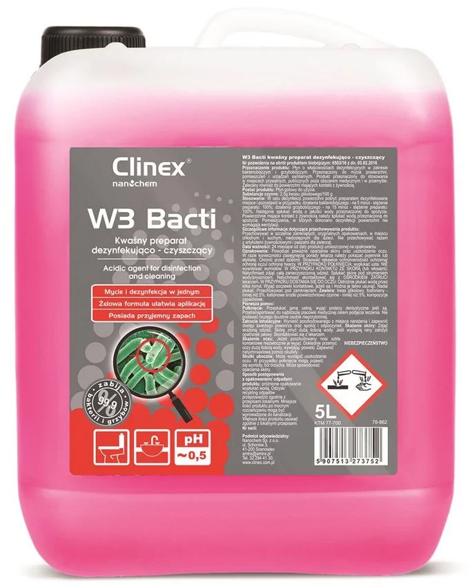Clinex W3 Bacti 5L to profesjonalny preparat czyszcząco–dezynfekujący przeznaczony do utrzymania najwyższego poziomu higieny w sanitariatach, kuchniach oraz pomieszczeniach, w których liczy się nie tylko czystość widoczna gołym okiem, ale także bezpieczeństwo mikrobiologiczne. Formuła oparta na kwasie glikolowym łączy skuteczne usuwanie zabrudzeń typowych dla łazienek i toalet z działaniem bakteriobójczym i grzybobójczym, dzięki czemu jedna aplikacja pozwala zarówno umyć, jak i zdezynfekować powierzchnię. Produkt nadaje się również do stosowania na powierzchniach mających kontakt z żywnością, co czyni go uniwersalnym rozwiązaniem dla gastronomii, obiektów użyteczności publicznej, firm sprzątających oraz użytkowników wymagających najwyższego poziomu higieny. Po zastosowaniu preparatu konieczne jest spłukanie go wodą, natomiast pomieszczenia po dezynfekcji nie wymagają dodatkowej wentylacji, co znacząco ułatwia i przyspiesza pracę.