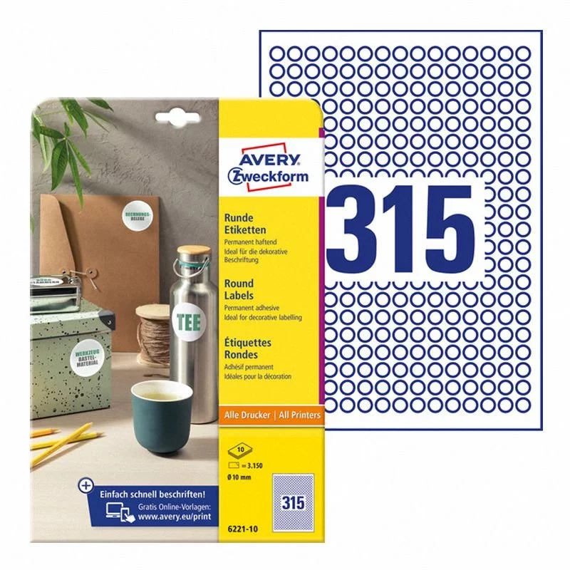 Etykiety Samop. Avery Okrągłe śr. 10mm 315/A4 Trwałe Białe No.6221-10