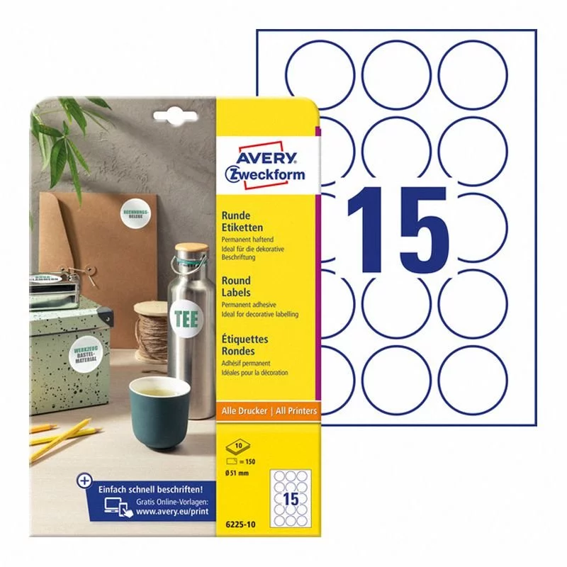 Etykiety Samop. Avery Okrągłe śr. 51mm 15/A4 Trwałe Białe No.6225-10