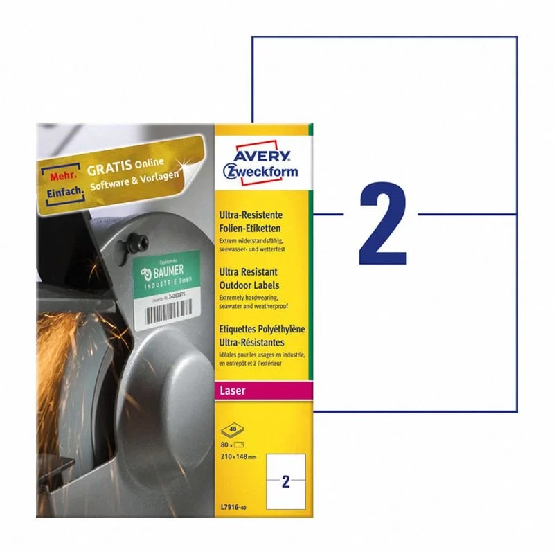 Etykiety Polietylenowe Ultra Resistant Avery 210x148 2/A4 A'40 Białe No.L7916-40