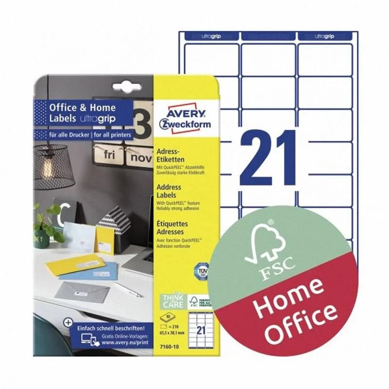 Etykiety Adresowe Avery UltraGrip Office&Home 63,5x38,1 21/A4 A'10 Białe No.7160-10