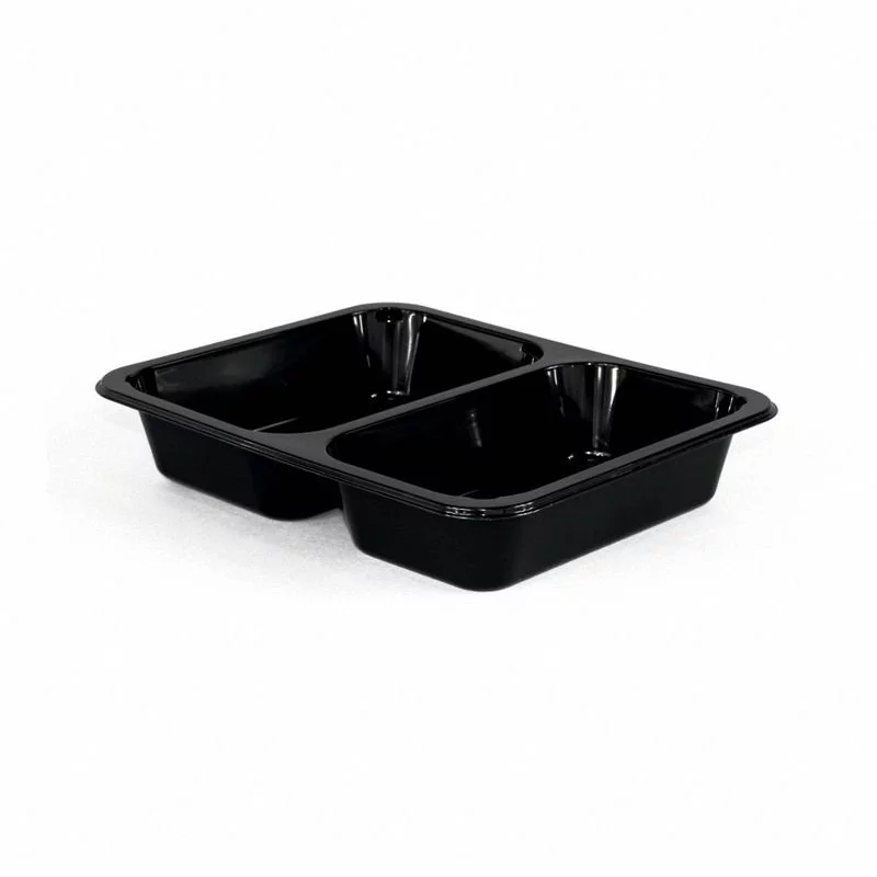 Wysokiej jakości dwu-komorowy pojemnik, tacka do zgrzewu, czarna, gładka. Główne zastosowanie: catering, diety pudełkowe.