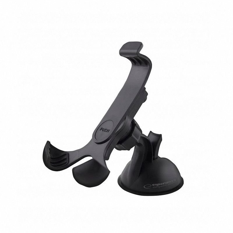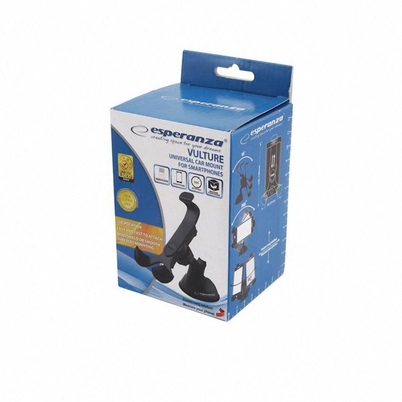 Uniwersalny uchwyt samochodowy Esperanza VULTURE do smartfonów. Uchwyt można zamontować na każdej gładkiej powierzchni, takiej jak szyba przednia w samochodzie. W celu zamocowania uchwytu wystarczy przycisnąć element z gumową membraną do szyby i nacisnąć zacisk blokujący. Zwolnienie zacisku powoduje oderwanie się uchwytu od powierzchni, do której jest przymocowany. Uchwyt umożliwia obrót smartfonu w zakresie 360o i ustawienia go w dowolnej pozycji i pod dowolnym kątem.