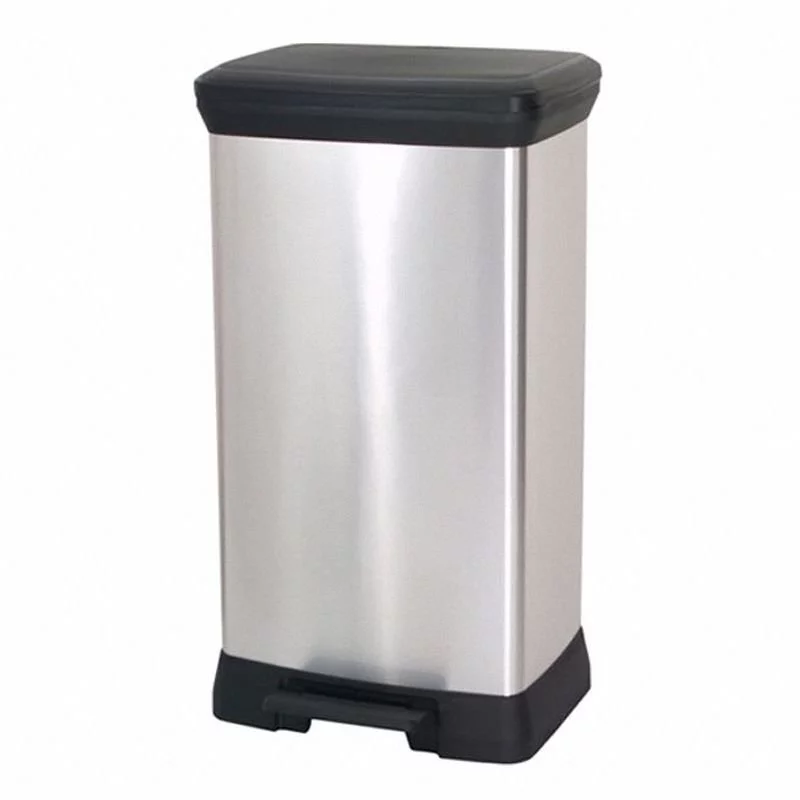 - Kosz na śmieci Curver 50 l z pedałem, plastikowy z metalizowaną czarno-srebrną powierzchnią. Prostokątny, nowoczesny design, lekk i higieniczny – otwierany nogą, z zamykaną pokrywą.